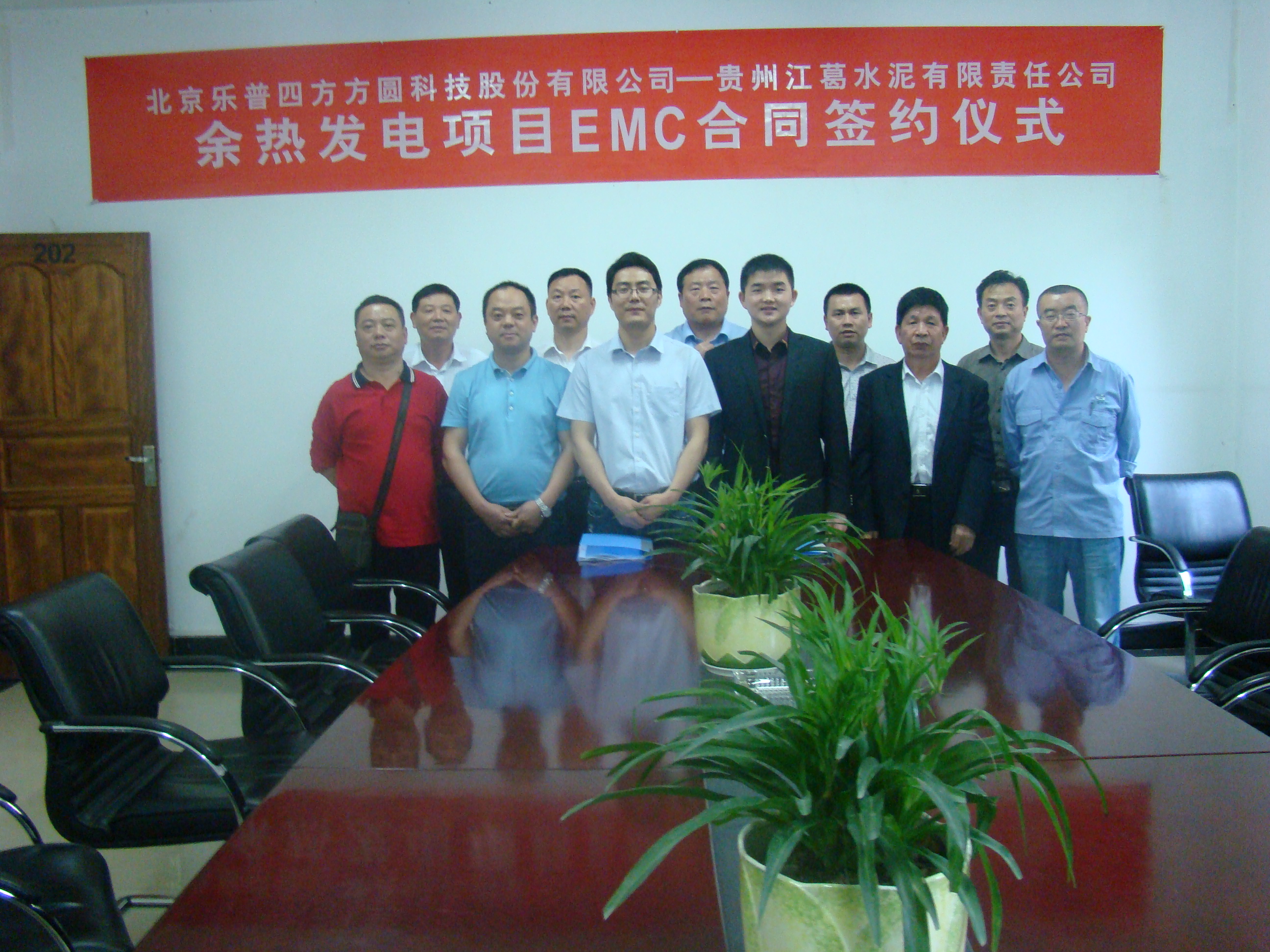 2015年5月10日,貴州江葛水泥有限責(zé)任公司余熱發(fā)電項(xiàng)目合同能源管理(EMC)簽約儀式在貴州江葛水泥有限責(zé)任公司會議室隆重舉行,貴州江葛水泥有限責(zé)任公司副總經(jīng)理林沛良、許小明等同志與北京樂普四方方圓科技股份有限公司總經(jīng)理毛文劍等同志共同參加了簽約儀式。